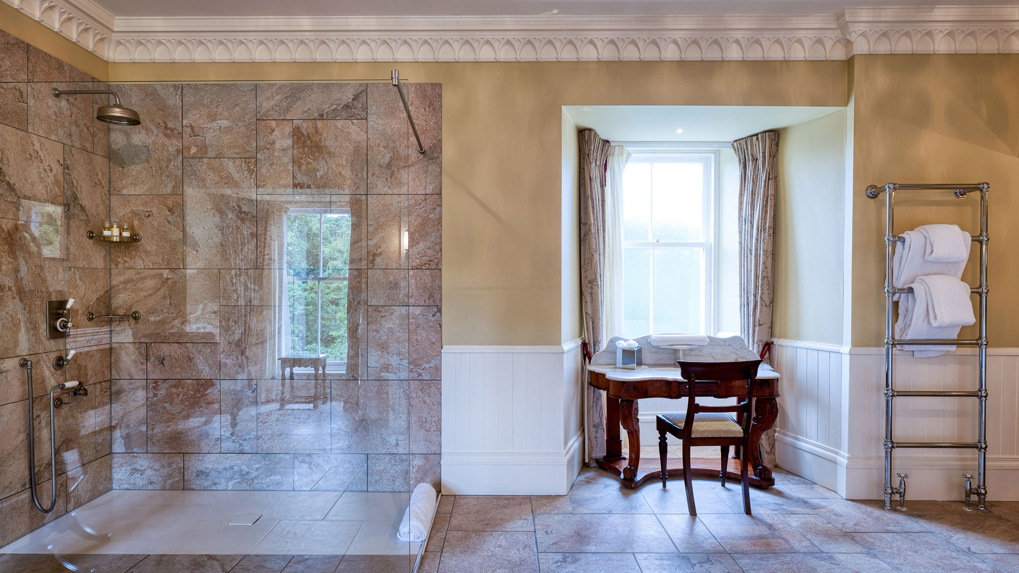 Ascend a spiralling stone staircase in your very own four-storey castle tower and come face to face with your wildest dreams. A majestic, hand-carved four-poster bed beckons, but not before you stand at the period windows and soak in the uninterrupted views of the estate. Sumptuous drapery, antique furniture and a roll-top tub for tranquil pampering complete the scene.